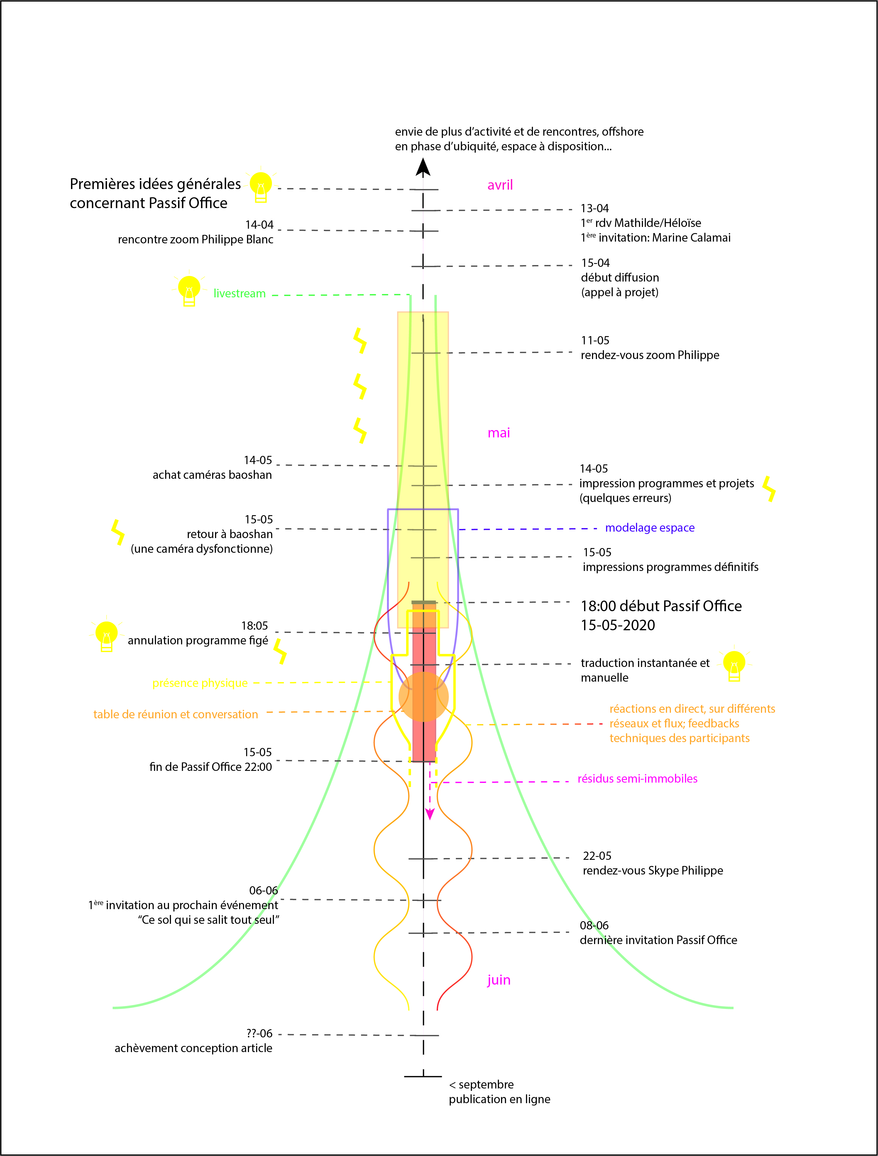 Le livestream, tant dans son organisation technique que dans sa mise en pratique remet en question la médiation. Les nombreux échanges que nous avons pu avoir avec Philippe Blanc ont souvent gravité autour de cette problématique. Ces discussions nous ont aidées tout au long du projet, en plus de la mise à disposition de bourg3on.net, d’un très fort soutien technique, et de feedbacks très constructifs quant au contenu de Passif Office.